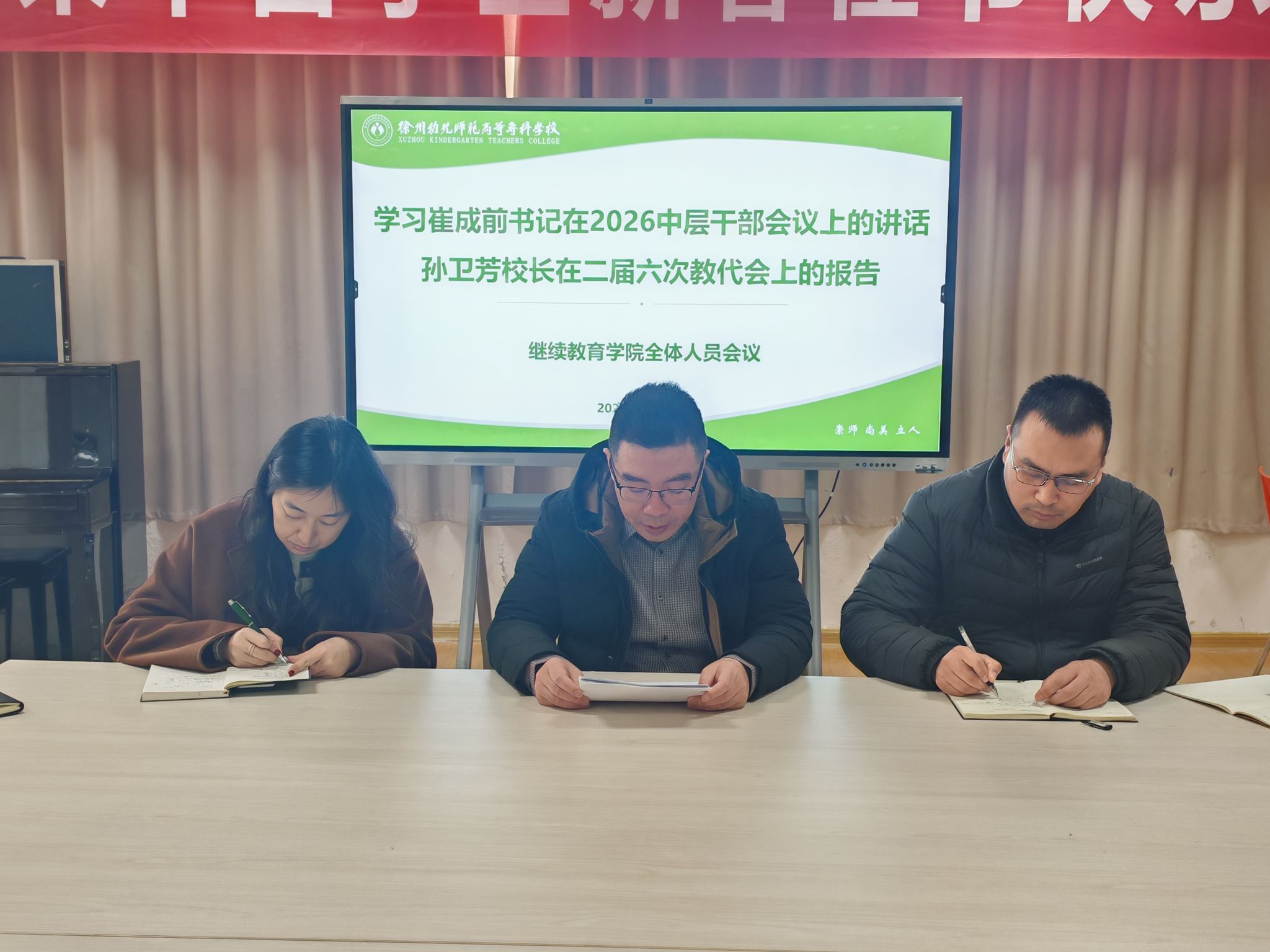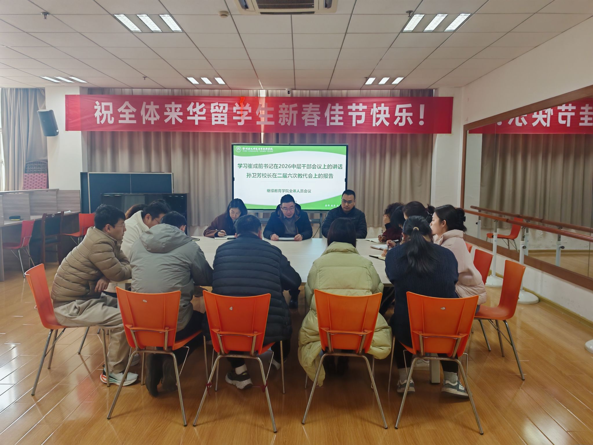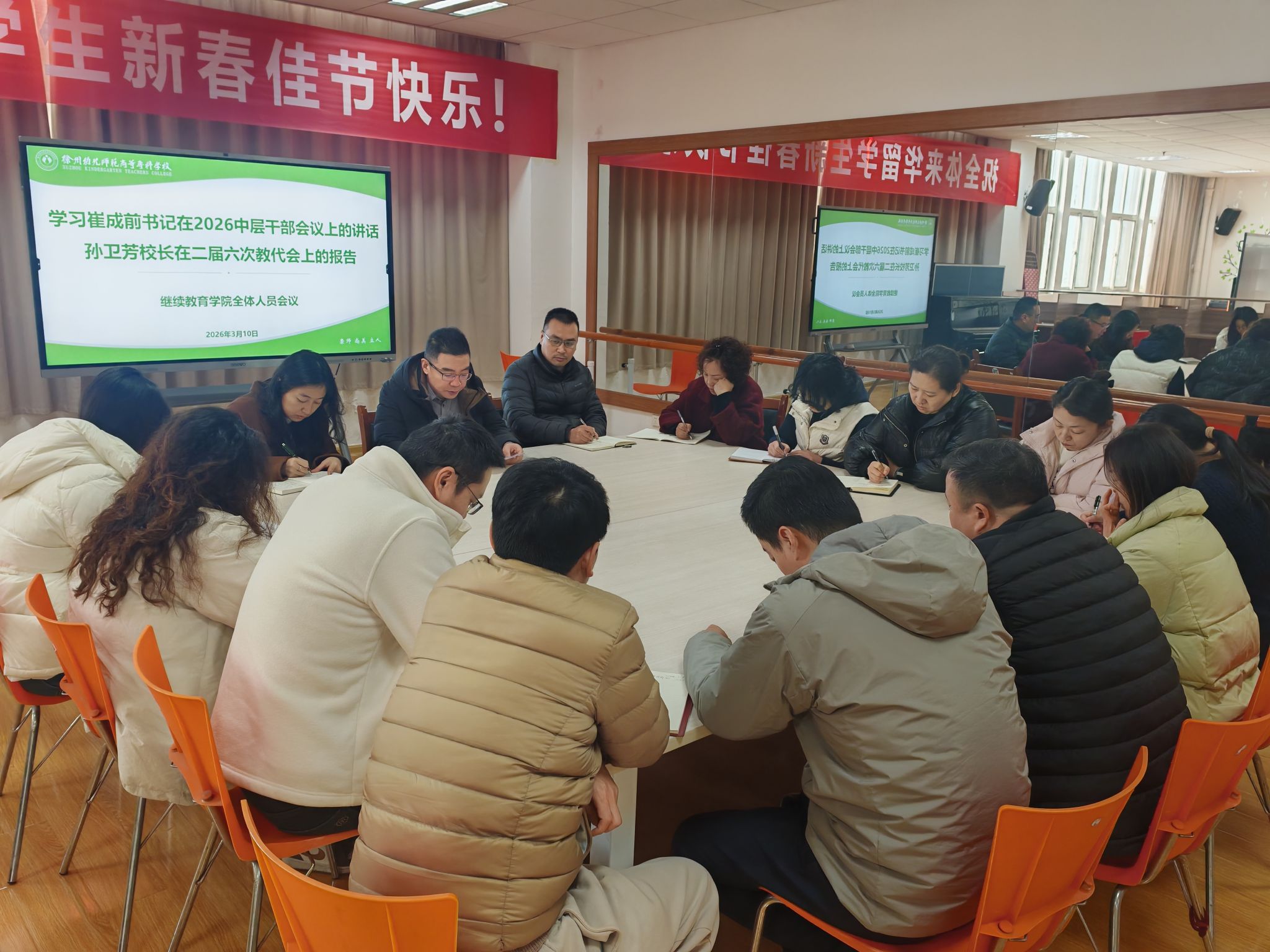 2026年3月10日,培训处召开新学期第一次全体人员会议,深入学习贯彻学校崔成前书记中层干部大会上的讲话、孙卫芳校长在教代会上的工作报告精神,统一思想、凝聚共识,部署2026年重点工作,动员全部门以实干担当推动继续教育高质量、特色化发展,为学校“十五五”开局贡献力量。